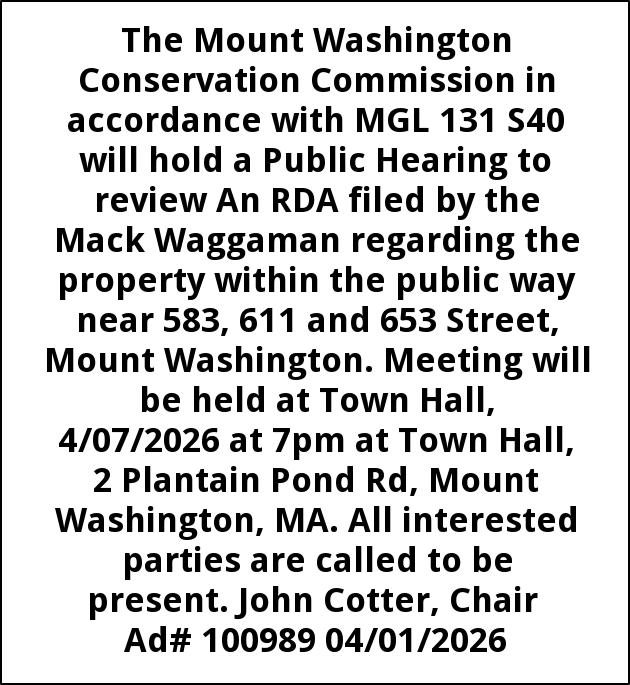 The Mount Washington Conservation Commission in accordance with MGL 131 S40 will hold a Public Hearing to review An RDA filed by the Mack Waggaman regarding the property within the public way near 583, 611 and 653 Street, Mount Washington. Meeting will be held at Town Hall, 4/07/2026 at 7pm at Town Hall, 2 Plantain Pond Rd, Mount Washington, MA. All interested parties are called to be present. John Cotter, Chair Ad# 100989 04/01/2026