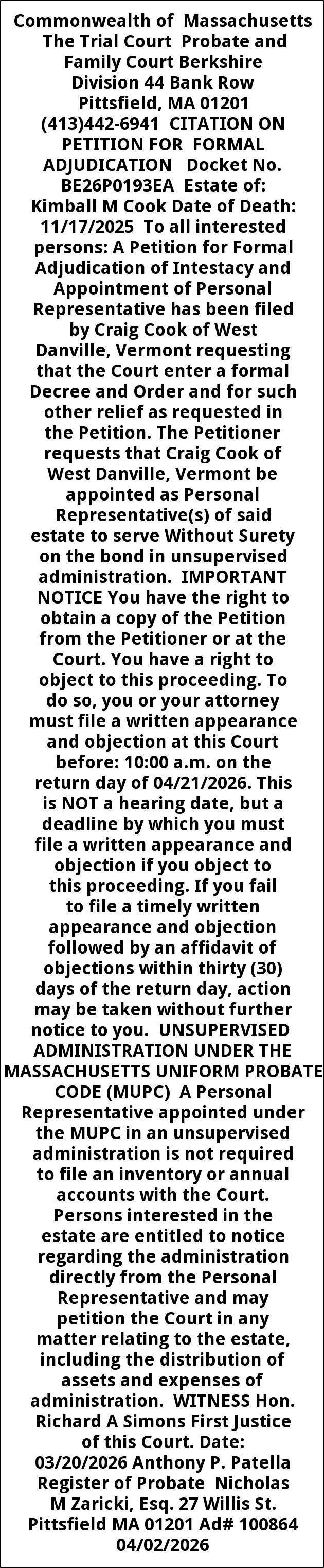Commonwealth of Massachusetts The Trial Court Probate and Family Court Berkshire Division 44 Bank Row Pittsfield, MA 01201 (413)442-6941 CITATION ON PETITION FOR FORMAL ADJUDICATION Docket No. BE26P0193EA Estate of: Kimball M Cook Date of Death: 11/17/2025 To all interested persons: A Petition for Formal Adjudication of Intestacy and Appointment of Personal Representative has been filed by Craig Cook of West Danville, Vermont requesting that the Court enter a formal Decree and Order and for such other relief as requested in the Petition. The Petitioner requests that Craig Cook of West Danville, Vermont be appointed as Personal Representative(s) of said estate to serve Without Surety on the bond in unsupervised administration. IMPORTANT NOTICE You have the right to obtain a copy of the Petition from the Petitioner or at the Court. You have a right to object to this proceeding. To do so, you or your attorney must file a written appearance and objection at this Court before: 10:00 a.m. on the return day of 04/21/2026. This is NOT a hearing date, but a deadline by which you must file a written appearance and objection if you object to this proceeding. If you fail to file a timely written appearance and objection followed by an affidavit of objections within thirty (30) days of the return day, action may be taken without further notice to you. UNSUPERVISED ADMINISTRATION UNDER THE MASSACHUSETTS UNIFORM PROBATE CODE (MUPC) A Personal Representative appointed under the MUPC in an unsupervised administration is not required to file an inventory or annual accounts with the Court. Persons interested in the estate are entitled to notice regarding the administration directly from the Personal Representative and may petition the Court in any matter relating to the estate, including the distribution of assets and expenses of administration. WITNESS Hon. Richard A Simons First Justice of this Court. Date: 03/20/2026 Anthony P. Patella Register of Probate Nicholas M Zaricki, Esq. 27 Willis St. Pittsfield MA 01201 Ad# 100864 04/02/2026