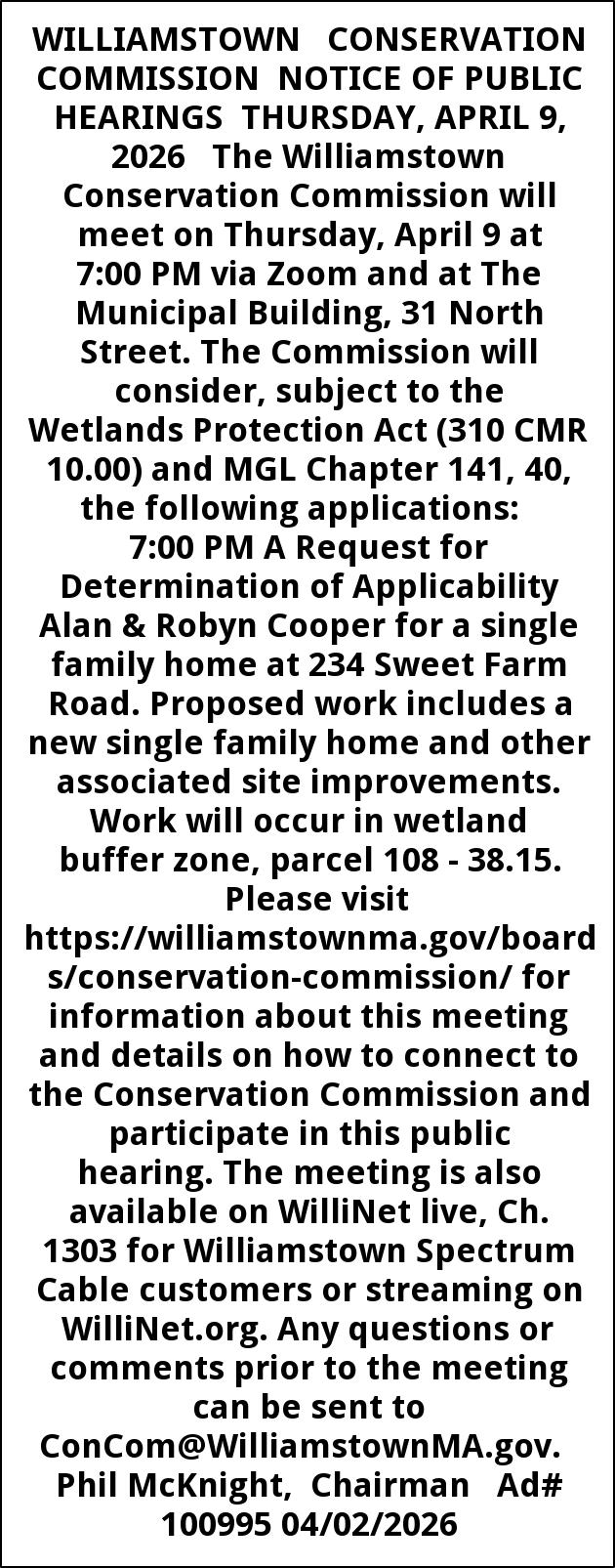 WILLIAMSTOWN CONSERVATION COMMISSION NOTICE OF PUBLIC HEARINGS THURSDAY, APRIL 9, 2026 The Williamstown Conservation Commission will meet on Thursday, April 9 at 7:00 PM via Zoom and at The Municipal Building, 31 North Street. The Commission will consider, subject to the Wetlands Protection Act (310 CMR 10.00) and MGL Chapter 141, 40, the following applications: 7:00 PM A Request for Determination of Applicability Alan & Robyn Cooper for a single family home at 234 Sweet Farm Road. Proposed work includes a new single family home and other associated site improvements. Work will occur in wetland buffer zone, parcel 108 - 38.15. Please visit https://williamstownma.gov/boards/conservation-commission/ for information about this meeting and details on how to connect to the Conservation Commission and participate in this public hearing. The meeting is also available on WilliNet live, Ch. 1303 for Williamstown Spectrum Cable customers or streaming on WilliNet.org. Any questions or comments prior to the meeting can be sent to ConCom@WilliamstownMA.gov. Phil McKnight, Chairman Ad# 100995 04/02/2026