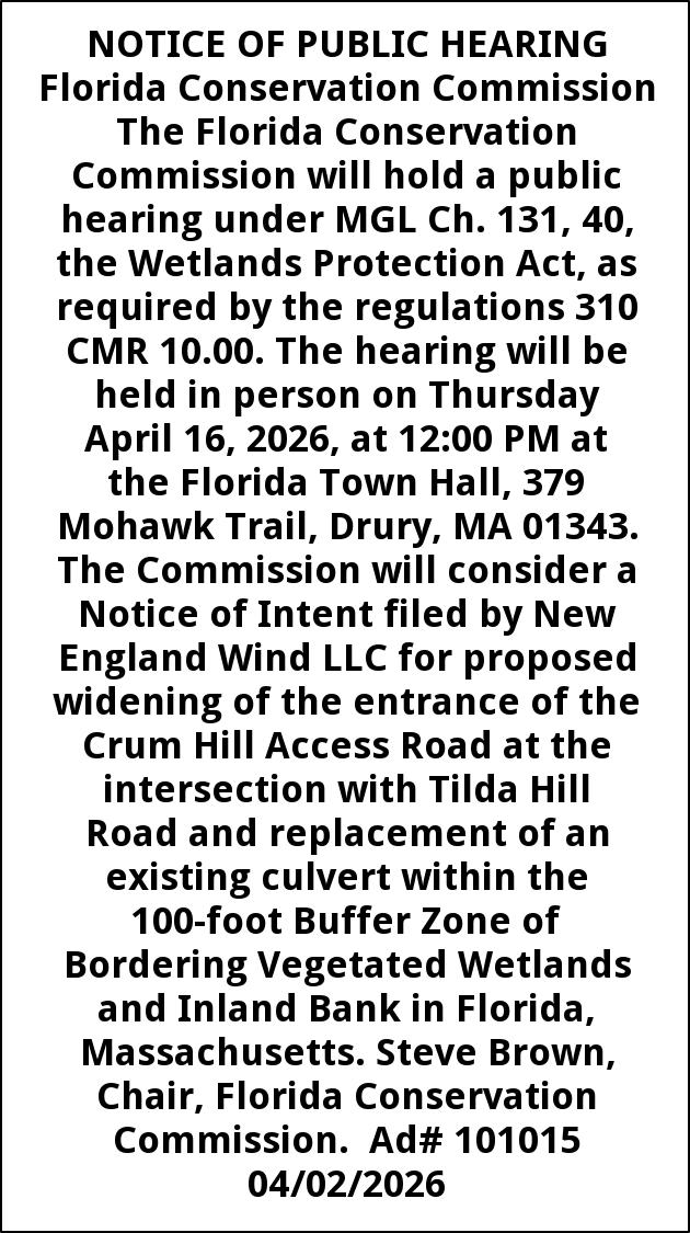 NOTICE OF PUBLIC HEARING Florida Conservation Commission The Florida Conservation Commission will hold a public hearing under MGL Ch. 131, 40, the Wetlands Protection Act, as required by the regulations 310 CMR 10.00. The hearing will be held in person on Thursday April 16, 2026, at 12:00 PM at the Florida Town Hall, 379 Mohawk Trail, Drury, MA 01343. The Commission will consider a Notice of Intent filed by New England Wind LLC for proposed widening of the entrance of the Crum Hill Access Road at the intersection with Tilda Hill Road and replacement of an existing culvert within the 100-foot Buffer Zone of Bordering Vegetated Wetlands and Inland Bank in Florida, Massachusetts. Steve Brown, Chair, Florida Conservation Commission. Ad# 101015 04/02/2026