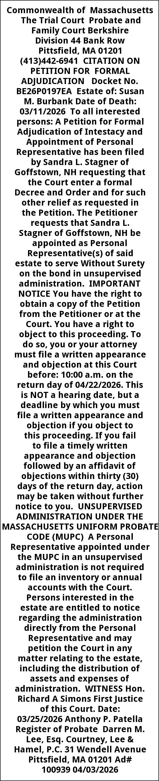 Commonwealth of Massachusetts The Trial Court Probate and Family Court Berkshire Division 44 Bank Row Pittsfield, MA 01201 (413)442-6941 CITATION ON PETITION FOR FORMAL ADJUDICATION Docket No. BE26P0197EA Estate of: Susan M. Burbank Date of Death: 03/11/2026 To all interested persons: A Petition for Formal Adjudication of Intestacy and Appointment of Personal Representative has been filed by Sandra L. Stagner of Goffstown, NH requesting that the Court enter a formal Decree and Order and for such other relief as requested in the Petition. The Petitioner requests that Sandra L. Stagner of Goffstown, NH be appointed as Personal Representative(s) of said estate to serve Without Surety on the bond in unsupervised administration. IMPORTANT NOTICE You have the right to obtain a copy of the Petition from the Petitioner or at the Court. You have a right to object to this proceeding. To do so, you or your attorney must file a written appearance and objection at this Court before: 10:00 a.m. on the return day of 04/22/2026. This is NOT a hearing date, but a deadline by which you must file a written appearance and objection if you object to this proceeding. If you fail to file a timely written appearance and objection followed by an affidavit of objections within thirty (30) days of the return day, action may be taken without further notice to you. UNSUPERVISED ADMINISTRATION UNDER THE MASSACHUSETTS UNIFORM PROBATE CODE (MUPC) A Personal Representative appointed under the MUPC in an unsupervised administration is not required to file an inventory or annual accounts with the Court. Persons interested in the estate are entitled to notice regarding the administration directly from the Personal Representative and may petition the Court in any matter relating to the estate, including the distribution of assets and expenses of administration. WITNESS Hon. Richard A Simons First Justice of this Court. Date: 03/25/2026 Anthony P. Patella Register of Probate Darren M. Lee, Esq. Courtney, Lee & Hamel, P.C. 31 Wendell Avenue Pittsfield, MA 01201 Ad# 100939 04/03/2026