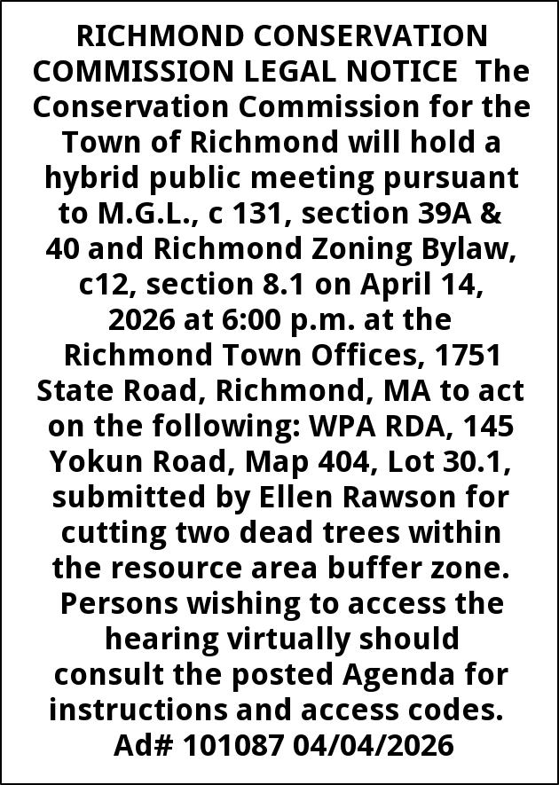 RICHMOND CONSERVATION COMMISSION LEGAL NOTICE The Conservation Commission for the Town of Richmond will hold a hybrid public meeting pursuant to M.G.L., c 131, section 39A & 40 and Richmond Zoning Bylaw, c12, section 8.1 on April 14, 2026 at 6:00 p.m. at the Richmond Town Offices, 1751 State Road, Richmond, MA to act on the following: WPA RDA, 145 Yokun Road, Map 404, Lot 30.1, submitted by Ellen Rawson for cutting two dead trees within the resource area buffer zone. Persons wishing to access the hearing virtually should consult the posted Agenda for instructions and access codes. Ad# 101087 04/04/2026