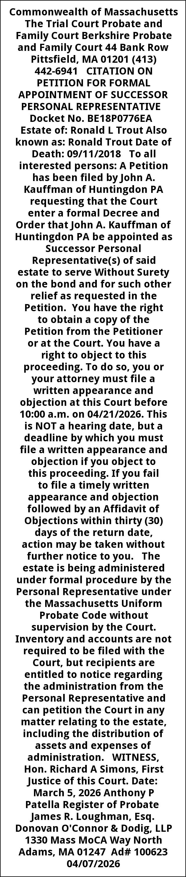 Commonwealth of Massachusetts The Trial Court Probate and Family Court Berkshire Probate and Family Court 44 Bank Row Pittsfield, MA 01201 (413) 442-6941 CITATION ON PETITION FOR FORMAL APPOINTMENT OF SUCCESSOR PERSONAL REPRESENTATIVE Docket No. BE18P0776EA Estate of: Ronald L Trout Also known as: Ronald Trout Date of Death: 09/11/2018 To all interested persons: A Petition has been filed by John A. Kauffman of Huntingdon PA requesting that the Court enter a formal Decree and Order that John A. Kauffman of Huntingdon PA be appointed as Successor Personal Representative(s) of said estate to serve Without Surety on the bond and for such other relief as requested in the Petition. You have the right to obtain a copy of the Petition from the Petitioner or at the Court. You have a right to object to this proceeding. To do so, you or your attorney must file a written appearance and objection at this Court before 10:00 a.m. on 04/21/2026. This is NOT a hearing date, but a deadline by which you must file a written appearance and objection if you object to this proceeding. If you fail to file a timely written appearance and objection followed by an Affidavit of Objections within thirty (30) days of the return date, action may be taken without further notice to you. The estate is being administered under formal procedure by the Personal Representative under the Massachusetts Uniform Probate Code without supervision by the Court. Inventory and accounts are not required to be filed with the Court, but recipients are entitled to notice regarding the administration from the Personal Representative and can petition the Court in any matter relating to the estate, including the distribution of assets and expenses of administration. WITNESS, Hon. Richard A Simons, First Justice of this Court. Date: March 5, 2026 Anthony P Patella Register of Probate James R. Loughman, Esq. Donovan O'Connor & Dodig, LLP 1330 Mass MoCA Way North Adams, MA 01247 Ad# 100623 04/07/2026