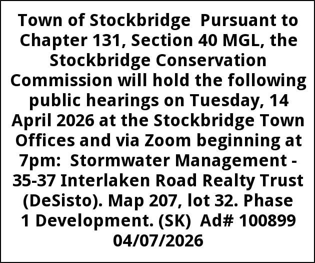 Town of Stockbridge Pursuant to Chapter 131, Section 40 MGL, the Stockbridge Conservation Commission will hold the following public hearings on Tuesday, 14 April 2026 at the Stockbridge Town Offices and via Zoom beginning at 7pm: Stormwater Management - 35-37 Interlaken Road Realty Trust (DeSisto). Map 207, lot 32. Phase 1 Development. (SK) Ad# 100899 04/07/2026