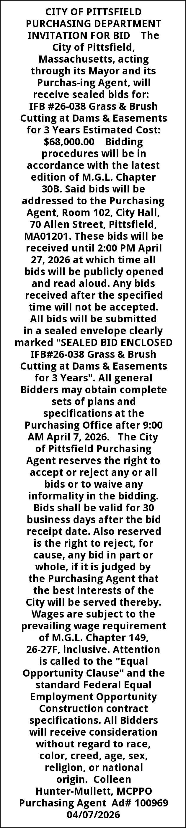 CITY OF PITTSFIELD PURCHASING DEPARTMENT INVITATION FOR BID The City of Pittsfield, Massachusetts, acting through its Mayor and its Purchas-ing Agent, will receive sealed bids for: IFB #26-038 Grass & Brush Cutting at Dams & Easements for 3 Years Estimated Cost: $68,000.00 Bidding procedures will be in accordance with the latest edition of M.G.L. Chapter 30B. Said bids will be addressed to the Purchasing Agent, Room 102, City Hall, 70 Allen Street, Pittsfield, MA01201. These bids will be received until 2:00 PM April 27, 2026 at which time all bids will be publicly opened and read aloud. Any bids received after the specified time will not be accepted. All bids will be submitted in a sealed envelope clearly marked "SEALED BID ENCLOSED IFB#26-038 Grass & Brush Cutting at Dams & Easements for 3 Years". All general Bidders may obtain complete sets of plans and specifications at the Purchasing Office after 9:00 AM April 7, 2026. The City of Pittsfield Purchasing Agent reserves the right to accept or reject any or all bids or to waive any informality in the bidding. Bids shall be valid for 30 business days after the bid receipt date. Also reserved is the right to reject, for cause, any bid in part or whole, if it is judged by the Purchasing Agent that the best interests of the City will be served thereby. Wages are subject to the prevailing wage requirement of M.G.L. Chapter 149, 26-27F, inclusive. Attention is called to the "Equal Opportunity Clause" and the standard Federal Equal Employment Opportunity Construction contract specifications. All Bidders will receive consideration without regard to race, color, creed, age, sex, religion, or national origin. Colleen Hunter-Mullett, MCPPO Purchasing Agent Ad# 100969 04/07/2026