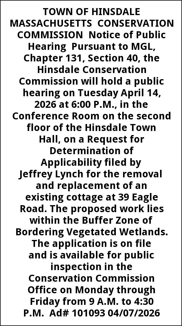 TOWN OF HINSDALE MASSACHUSETTS CONSERVATION COMMISSION Notice of Public Hearing Pursuant to MGL, Chapter 131, Section 40, the Hinsdale Conservation Commission will hold a public hearing on Tuesday April 14, 2026 at 6:00 P.M., in the Conference Room on the second floor of the Hinsdale Town Hall, on a Request for Determination of Applicability filed by Jeffrey Lynch for the removal and replacement of an existing cottage at 39 Eagle Road. The proposed work lies within the Buffer Zone of Bordering Vegetated Wetlands. The application is on file and is available for public inspection in the Conservation Commission Office on Monday through Friday from 9 A.M. to 4:30 P.M. Ad# 101093 04/07/2026
