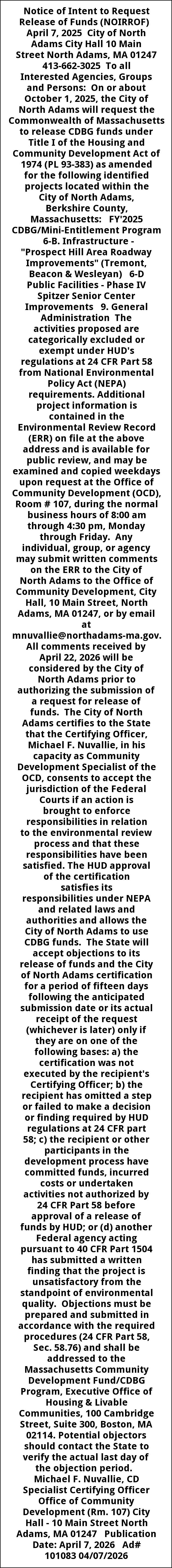 Notice of Intent to Request Release of Funds (NOIRROF) April 7, 2025 City of North Adams City Hall 10 Main Street North Adams, MA 01247 413-662-3025 To all Interested Agencies, Groups and Persons: On or about October 1, 2025, the City of North Adams will request the Commonwealth of Massachusetts to release CDBG funds under Title I of the Housing and Community Development Act of 1974 (PL 93-383) as amended for the following identified projects located within the City of North Adams, Berkshire County, Massachusetts: FY'2025 CDBG/Mini-Entitlement Program 6-B. Infrastructure - "Prospect Hill Area Roadway Improvements" (Tremont, Beacon & Wesleyan) 6-D Public Facilities - Phase IV Spitzer Senior Center Improvements 9. General Administration The activities proposed are categorically excluded or exempt under HUD's regulations at 24 CFR Part 58 from National Environmental Policy Act (NEPA) requirements. Additional project information is contained in the Environmental Review Record (ERR) on file at the above address and is available for public review, and may be examined and copied weekdays upon request at the Office of Community Development (OCD), Room # 107, during the normal business hours of 8:00 am through 4:30 pm, Monday through Friday. Any individual, group, or agency may submit written comments on the ERR to the City of North Adams to the Office of Community Development, City Hall, 10 Main Street, North Adams, MA 01247, or by email at mnuvallie@northadams-ma.gov. All comments received by April 22, 2026 will be considered by the City of North Adams prior to authorizing the submission of a request for release of funds. The City of North Adams certifies to the State that the Certifying Officer, Michael F. Nuvallie, in his capacity as Community Development Specialist of the OCD, consents to accept the jurisdiction of the Federal Courts if an action is brought to enforce responsibilities in relation to the environmental review process and that these responsibilities have been satisfied. The HUD approval of the certification satisfies its responsibilities under NEPA and related laws and authorities and allows the City of North Adams to use CDBG funds. The State will accept objections to its release of funds and the City of North Adams certification for a period of fifteen days following the anticipated submission date or its actual receipt of the request (whichever is later) only if they are on one of the following bases: a) the certification was not executed by the recipient's Certifying Officer; b) the recipient has omitted a step or failed to make a decision or finding required by HUD regulations at 24 CFR part 58; c) the recipient or other participants in the development process have committed funds, incurred costs or undertaken activities not authorized by 24 CFR Part 58 before approval of a release of funds by HUD; or (d) another Federal agency acting pursuant to 40 CFR Part 1504 has submitted a written finding that the project is unsatisfactory from the standpoint of environmental quality. Objections must be prepared and submitted in accordance with the required procedures (24 CFR Part 58, Sec. 58.76) and shall be addressed to the Massachusetts Community Development Fund/CDBG Program, Executive Office of Housing & Livable Communities, 100 Cambridge Street, Suite 300, Boston, MA 02114. Potential objectors should contact the State to verify the actual last day of the objection period. Michael F. Nuvallie, CD Specialist Certifying Officer Office of Community Development (Rm. 107) City Hall - 10 Main Street North Adams, MA 01247 Publication Date: April 7, 2026 Ad# 101083 04/07/2026