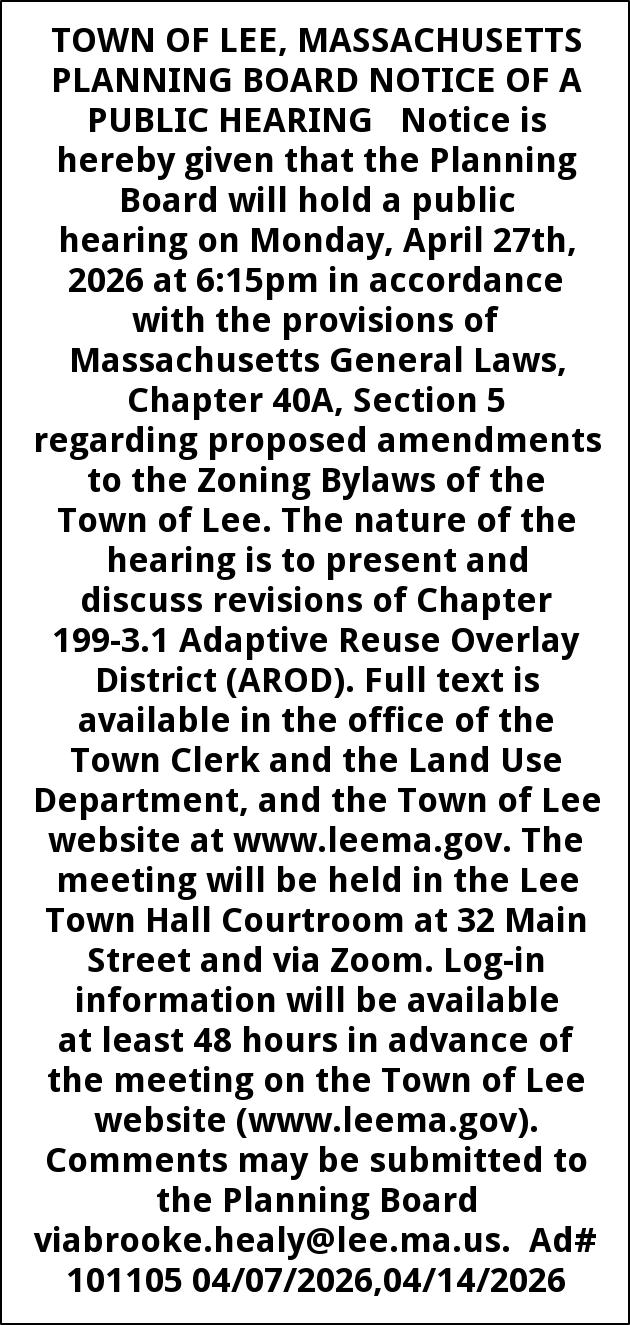 TOWN OF LEE, MASSACHUSETTS PLANNING BOARD NOTICE OF A PUBLIC HEARING Notice is hereby given that the Planning Board will hold a public hearing on Monday, April 27th, 2026 at 6:15pm in accordance with the provisions of Massachusetts General Laws, Chapter 40A, Section 5 regarding proposed amendments to the Zoning Bylaws of the Town of Lee. The nature of the hearing is to present and discuss revisions of Chapter 199-3.1 Adaptive Reuse Overlay District (AROD). Full text is available in the office of the Town Clerk and the Land Use Department, and the Town of Lee website at www.leema.gov. The meeting will be held in the Lee Town Hall Courtroom at 32 Main Street and via Zoom. Log-in information will be available at least 48 hours in advance of the meeting on the Town of Lee website (www.leema.gov). Comments may be submitted to the Planning Board viabrooke.healy@lee.ma.us. Ad# 101105 04/07/2026,04/14/2026