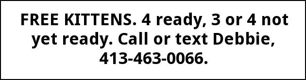 FREE KITTENS. 4 ready, 3 or 4 not yet ready. Call or text Debbie, 413-463-0066.