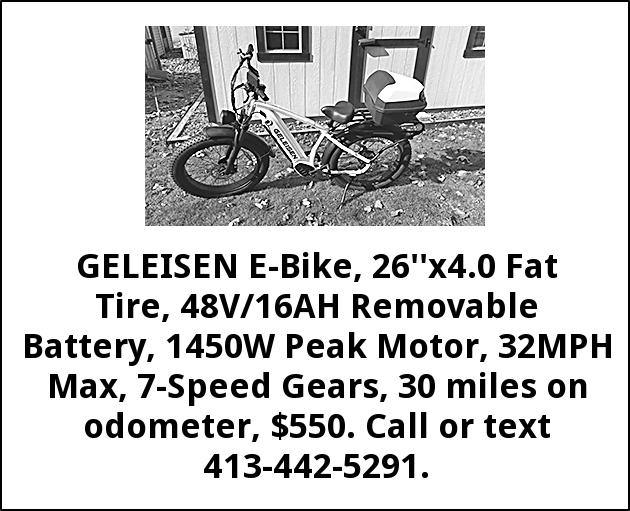 GELEISEN E-Bike, 26''x4.0 Fat Tire, 48V/16AH Removable Battery, 1450W Peak Motor, 32MPH Max, 7-Speed Gears, 30 miles on odometer, $550. Call or text 413-442-5291.