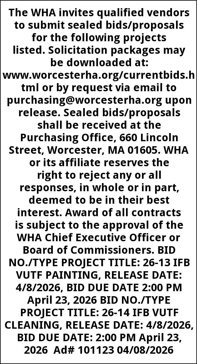 The WHA invites qualified vendors to submit sealed bids/proposals for the following projects listed. Solicitation packages may be downloaded at: www.worcesterha.org/currentbids.html or by request via email to purchasing@worcesterha.org upon release. Sealed bids/proposals shall be received at the Purchasing Office, 660 Lincoln Street, Worcester, MA 01605. WHA or its affiliate reserves the right to reject any or all responses, in whole or in part, deemed to be in their best interest. Award of all contracts is subject to the approval of the WHA Chief Executive Officer or Board of Commissioners. BID NO./TYPE PROJECT TITLE: 26-13 IFB VUTF PAINTING, RELEASE DATE: 4/8/2026, BID DUE DATE 2:00 PM April 23, 2026 BID NO./TYPE PROJECT TITLE: 26-14 IFB VUTF CLEANING, RELEASE DATE: 4/8/2026, BID DUE DATE: 2:00 PM April 23, 2026 Ad# 101123 04/08/2026
