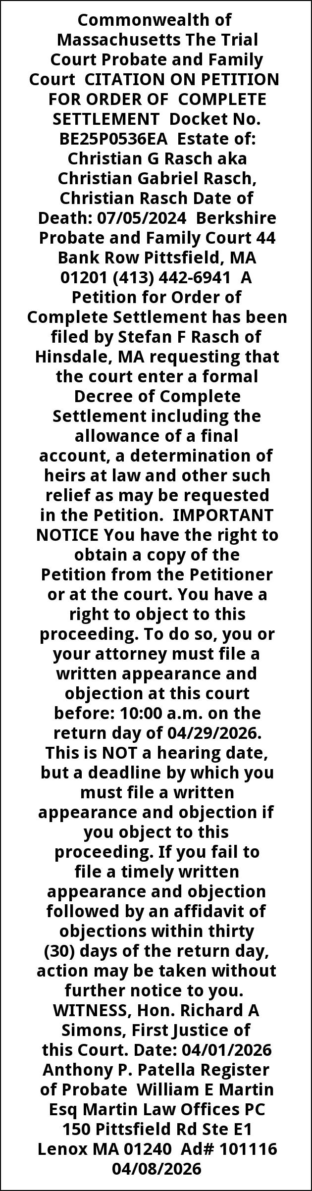 Commonwealth of Massachusetts The Trial Court Probate and Family Court CITATION ON PETITION FOR ORDER OF COMPLETE SETTLEMENT Docket No. BE25P0536EA Estate of: Christian G Rasch aka Christian Gabriel Rasch, Christian Rasch Date of Death: 07/05/2024 Berkshire Probate and Family Court 44 Bank Row Pittsfield, MA 01201 (413) 442-6941 A Petition for Order of Complete Settlement has been filed by Stefan F Rasch of Hinsdale, MA requesting that the court enter a formal Decree of Complete Settlement including the allowance of a final account, a determination of heirs at law and other such relief as may be requested in the Petition. IMPORTANT NOTICE You have the right to obtain a copy of the Petition from the Petitioner or at the court. You have a right to object to this proceeding. To do so, you or your attorney must file a written appearance and objection at this court before: 10:00 a.m. on the return day of 04/29/2026. This is NOT a hearing date, but a deadline by which you must file a written appearance and objection if you object to this proceeding. If you fail to file a timely written appearance and objection followed by an affidavit of objections within thirty (30) days of the return day, action may be taken without further notice to you. WITNESS, Hon. Richard A Simons, First Justice of this Court. Date: 04/01/2026 Anthony P. Patella Register of Probate William E Martin Esq Martin Law Offices PC 150 Pittsfield Rd Ste E1 Lenox MA 01240 Ad# 101116 04/08/2026