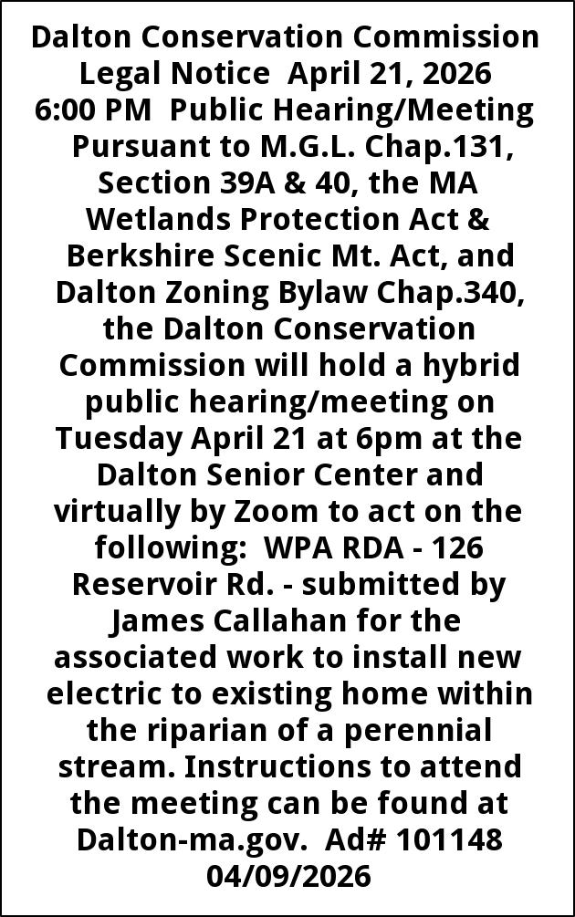 Dalton Conservation Commission Legal Notice April 21, 2026 6:00 PM Public Hearing/Meeting Pursuant to M.G.L. Chap.131, Section 39A & 40, the MA Wetlands Protection Act & Berkshire Scenic Mt. Act, and Dalton Zoning Bylaw Chap.340, the Dalton Conservation Commission will hold a hybrid public hearing/meeting on Tuesday April 21 at 6pm at the Dalton Senior Center and virtually by Zoom to act on the following: WPA RDA - 126 Reservoir Rd. - submitted by James Callahan for the associated work to install new electric to existing home within the riparian of a perennial stream. Instructions to attend the meeting can be found at Dalton-ma.gov. Ad# 101148 04/09/2026