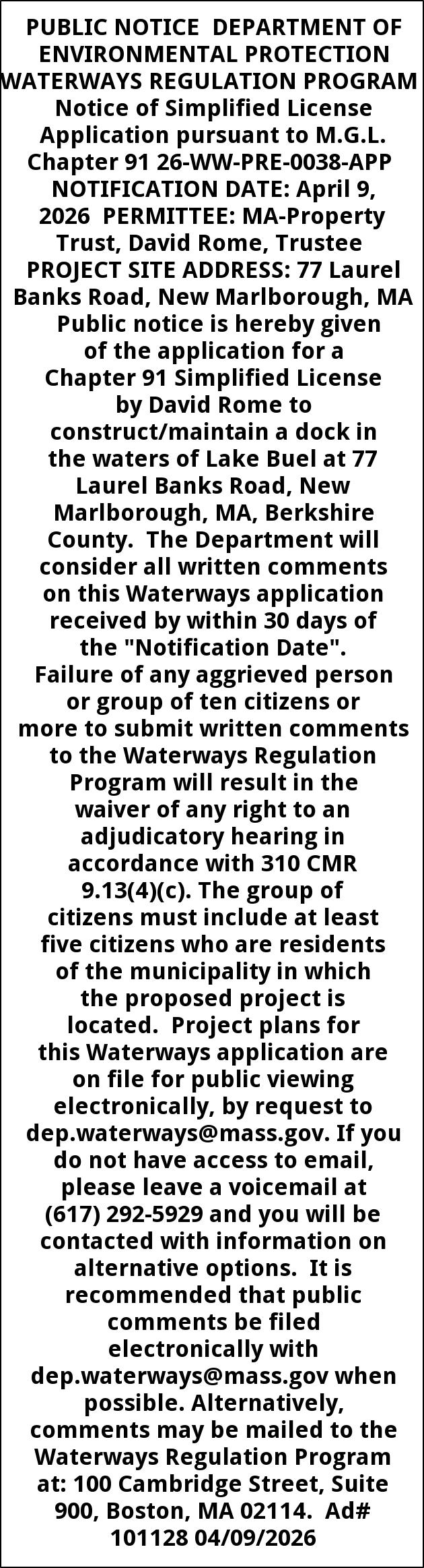 PUBLIC NOTICE DEPARTMENT OF ENVIRONMENTAL PROTECTION WATERWAYS REGULATION PROGRAM Notice of Simplified License Application pursuant to M.G.L. Chapter 91 26-WW-PRE-0038-APP NOTIFICATION DATE: April 9, 2026 PERMITTEE: MA-Property Trust, David Rome, Trustee PROJECT SITE ADDRESS: 77 Laurel Banks Road, New Marlborough, MA Public notice is hereby given of the application for a Chapter 91 Simplified License by David Rome to construct/maintain a dock in the waters of Lake Buel at 77 Laurel Banks Road, New Marlborough, MA, Berkshire County. The Department will consider all written comments on this Waterways application received by within 30 days of the "Notification Date". Failure of any aggrieved person or group of ten citizens or more to submit written comments to the Waterways Regulation Program will result in the waiver of any right to an adjudicatory hearing in accordance with 310 CMR 9.13(4)(c). The group of citizens must include at least five citizens who are residents of the municipality in which the proposed project is located. Project plans for this Waterways application are on file for public viewing electronically, by request to dep.waterways@mass.gov. If you do not have access to email, please leave a voicemail at (617) 292-5929 and you will be contacted with information on alternative options. It is recommended that public comments be filed electronically with dep.waterways@mass.gov when possible. Alternatively, comments may be mailed to the Waterways Regulation Program at: 100 Cambridge Street, Suite 900, Boston, MA 02114. Ad# 101128 04/09/2026