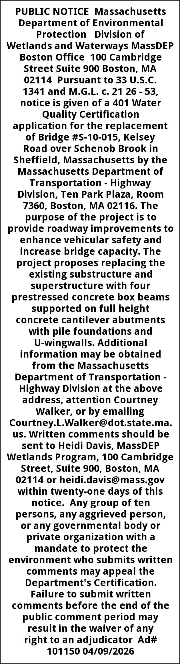 PUBLIC NOTICE Massachusetts Department of Environmental Protection Division of Wetlands and Waterways MassDEP Boston Office 100 Cambridge Street Suite 900 Boston, MA 02114 Pursuant to 33 U.S.C. 1341 and M.G.L. c. 21 26 - 53, notice is given of a 401 Water Quality Certification application for the replacement of Bridge #S-10-015, Kelsey Road over Schenob Brook in Sheffield, Massachusetts by the Massachusetts Department of Transportation - Highway Division, Ten Park Plaza, Room 7360, Boston, MA 02116. The purpose of the project is to provide roadway improvements to enhance vehicular safety and increase bridge capacity. The project proposes replacing the existing substructure and superstructure with four prestressed concrete box beams supported on full height concrete cantilever abutments with pile foundations and U-wingwalls. Additional information may be obtained from the Massachusetts Department of Transportation - Highway Division at the above address, attention Courtney Walker, or by emailing Courtney.L.Walker@dot.state.ma.us. Written comments should be sent to Heidi Davis, MassDEP Wetlands Program, 100 Cambridge Street, Suite 900, Boston, MA 02114 or heidi.davis@mass.gov within twenty-one days of this notice. Any group of ten persons, any aggrieved person, or any governmental body or private organization with a mandate to protect the environment who submits written comments may appeal the Department's Certification. Failure to submit written comments before the end of the public comment period may result in the waiver of any right to an adjudicator Ad# 101150 04/09/2026