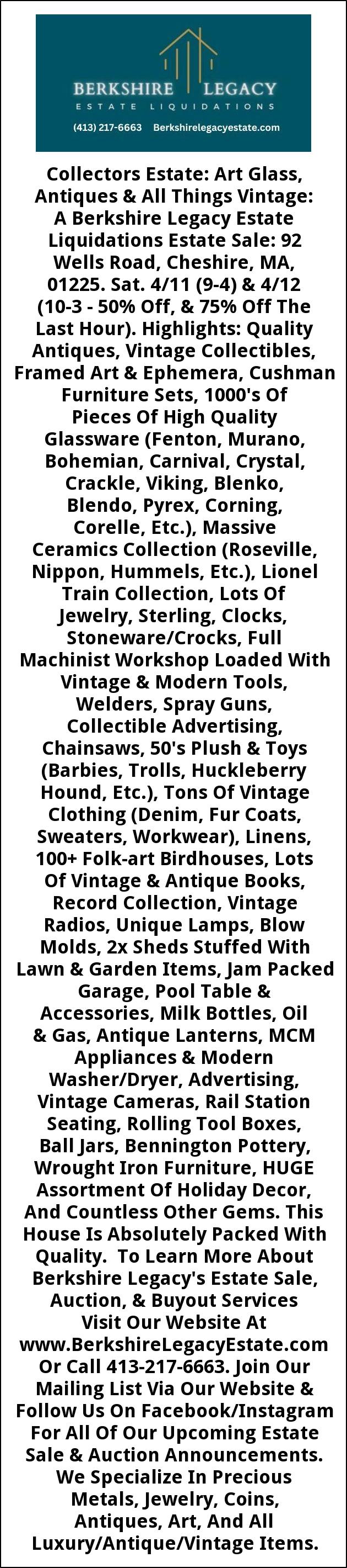 Collectors Estate: Art Glass, Antiques & All Things Vintage: A Berkshire Legacy Estate Liquidations Estate Sale: 92 Wells Road, Cheshire, MA, 01225. Sat. 4/11 (9-4) & 4/12 (10-3 - 50% Off, & 75% Off The Last Hour). Highlights: Quality Antiques, Vintage Collectibles, Framed Art & Ephemera, Cushman Furniture Sets, 1000's Of Pieces Of High Quality Glassware (Fenton, Murano, Bohemian, Carnival, Crystal, Crackle, Viking, Blenko, Blendo, Pyrex, Corning, Corelle, Etc.), Massive Ceramics Collection (Roseville, Nippon, Hummels, Etc.), Lionel Train Collection, Lots Of Jewelry, Sterling, Clocks, Stoneware/Crocks, Full Machinist Workshop Loaded With Vintage & Modern Tools, Welders, Spray Guns, Collectible Advertising, Chainsaws, 50's Plush & Toys (Barbies, Trolls, Huckleberry Hound, Etc.), Tons Of Vintage Clothing (Denim, Fur Coats, Sweaters, Workwear), Linens, 100+ Folk-art Birdhouses, Lots Of Vintage & Antique Books, Record Collection, Vintage Radios, Unique Lamps, Blow Molds, 2x Sheds Stuffed With Lawn & Garden Items, Jam Packed Garage, Pool Table & Accessories, Milk Bottles, Oil & Gas, Antique Lanterns, MCM Appliances & Modern Washer/Dryer, Advertising, Vintage Cameras, Rail Station Seating, Rolling Tool Boxes, Ball Jars, Bennington Pottery, Wrought Iron Furniture, HUGE Assortment Of Holiday Decor, And Countless Other Gems. This House Is Absolutely Packed With Quality. To Learn More About Berkshire Legacy's Estate Sale, Auction, & Buyout Services Visit Our Website At www.BerkshireLegacyEstate.com Or Call 413-217-6663. Join Our Mailing List Via Our Website & Follow Us On Facebook/Instagram For All Of Our Upcoming Estate Sale & Auction Announcements. We Specialize In Precious Metals, Jewelry, Coins, Antiques, Art, And All Luxury/Antique/Vintage Items.