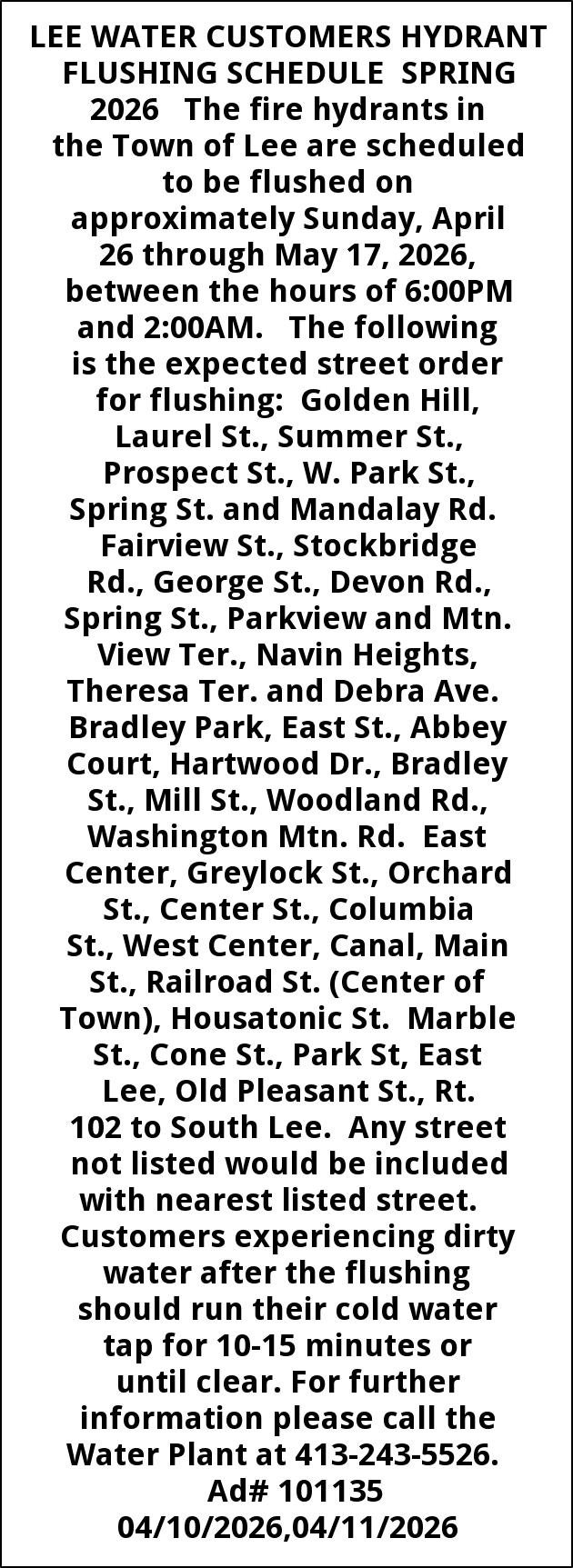 LEE WATER CUSTOMERS HYDRANT FLUSHING SCHEDULE SPRING 2026 The fire hydrants in the Town of Lee are scheduled to be flushed on approximately Sunday, April 26 through May 17, 2026, between the hours of 6:00PM and 2:00AM. The following is the expected street order for flushing: Golden Hill, Laurel St., Summer St., Prospect St., W. Park St., Spring St. and Mandalay Rd. Fairview St., Stockbridge Rd., George St., Devon Rd., Spring St., Parkview and Mtn. View Ter., Navin Heights, Theresa Ter. and Debra Ave. Bradley Park, East St., Abbey Court, Hartwood Dr., Bradley St., Mill St., Woodland Rd., Washington Mtn. Rd. East Center, Greylock St., Orchard St., Center St., Columbia St., West Center, Canal, Main St., Railroad St. (Center of Town), Housatonic St. Marble St., Cone St., Park St, East Lee, Old Pleasant St., Rt. 102 to South Lee. Any street not listed would be included with nearest listed street. Customers experiencing dirty water after the flushing should run their cold water tap for 10-15 minutes or until clear. For further information please call the Water Plant at 413-243-5526. Ad# 101135 04/10/2026,04/11/2026