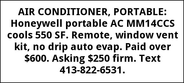 AIR CONDITIONER, PORTABLE: Honeywell portable AC MM14CCS cools 550 SF. Remote, window vent kit, no drip auto evap. Paid over $600. Asking $250 firm. Text 413-822-6531.