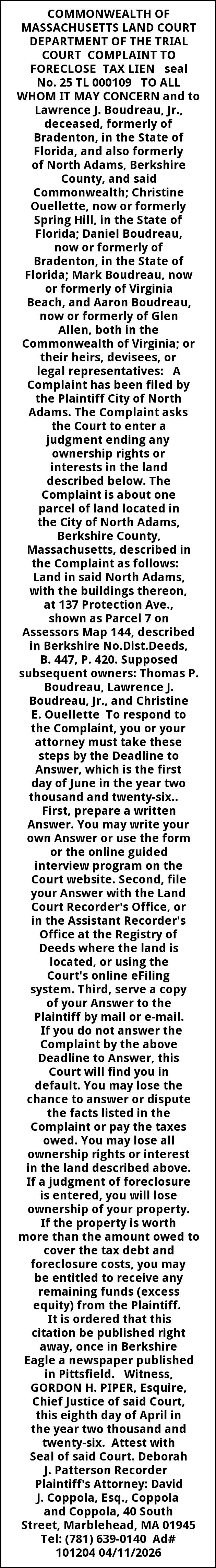 COMMONWEALTH OF MASSACHUSETTS LAND COURT DEPARTMENT OF THE TRIAL COURT COMPLAINT TO FORECLOSE TAX LIEN seal No. 25 TL 000109 TO ALL WHOM IT MAY CONCERN and to Lawrence J. Boudreau, Jr., deceased, formerly of Bradenton, in the State of Florida, and also formerly of North Adams, Berkshire County, and said Commonwealth; Christine Ouellette, now or formerly Spring Hill, in the State of Florida; Daniel Boudreau, now or formerly of Bradenton, in the State of Florida; Mark Boudreau, now or formerly of Virginia Beach, and Aaron Boudreau, now or formerly of Glen Allen, both in the Commonwealth of Virginia; or their heirs, devisees, or legal representatives: A Complaint has been filed by the Plaintiff City of North Adams. The Complaint asks the Court to enter a judgment ending any ownership rights or interests in the land described below. The Complaint is about one parcel of land located in the City of North Adams, Berkshire County, Massachusetts, described in the Complaint as follows: Land in said North Adams, with the buildings thereon, at 137 Protection Ave., shown as Parcel 7 on Assessors Map 144, described in Berkshire No.Dist.Deeds, B. 447, P. 420. Supposed subsequent owners: Thomas P. Boudreau, Lawrence J. Boudreau, Jr., and Christine E. Ouellette To respond to the Complaint, you or your attorney must take these steps by the Deadline to Answer, which is the first day of June in the year two thousand and twenty-six.. First, prepare a written Answer. You may write your own Answer or use the form or the online guided interview program on the Court website. Second, file your Answer with the Land Court Recorder's Office, or in the Assistant Recorder's Office at the Registry of Deeds where the land is located, or using the Court's online eFiling system. Third, serve a copy of your Answer to the Plaintiff by mail or e-mail. If you do not answer the Complaint by the above Deadline to Answer, this Court will find you in default. You may lose the chance to answer or dispute the facts listed in the Complaint or pay the taxes owed. You may lose all ownership rights or interest in the land described above. If a judgment of foreclosure is entered, you will lose ownership of your property. If the property is worth more than the amount owed to cover the tax debt and foreclosure costs, you may be entitled to receive any remaining funds (excess equity) from the Plaintiff. It is ordered that this citation be published right away, once in Berkshire Eagle a newspaper published in Pittsfield. Witness, GORDON H. PIPER, Esquire, Chief Justice of said Court, this eighth day of April in the year two thousand and twenty-six. Attest with Seal of said Court. Deborah J. Patterson Recorder Plaintiff's Attorney: David J. Coppola, Esq., Coppola and Coppola, 40 South Street, Marblehead, MA 01945 Tel: (781) 639-0140 Ad# 101204 04/11/2026