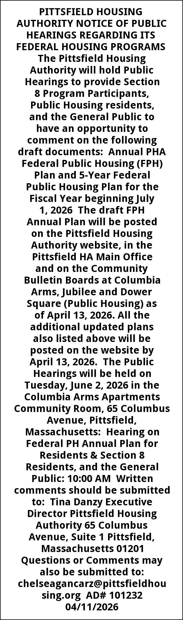 PITTSFIELD HOUSING AUTHORITY NOTICE OF PUBLIC HEARINGS REGARDING ITS FEDERAL HOUSING PROGRAMS The Pittsfield Housing Authority will hold Public Hearings to provide Section 8 Program Participants, Public Housing residents, and the General Public to have an opportunity to comment on the following draft documents: Annual PHA Federal Public Housing (FPH) Plan and 5-Year Federal Public Housing Plan for the Fiscal Year beginning July 1, 2026 The draft FPH Annual Plan will be posted on the Pittsfield Housing Authority website, in the Pittsfield HA Main Office and on the Community Bulletin Boards at Columbia Arms, Jubilee and Dower Square (Public Housing) as of April 13, 2026. All the additional updated plans also listed above will be posted on the website by April 13, 2026. The Public Hearings will be held on Tuesday, June 2, 2026 in the Columbia Arms Apartments Community Room, 65 Columbus Avenue, Pittsfield, Massachusetts: Hearing on Federal PH Annual Plan for Residents & Section 8 Residents, and the General Public: 10:00 AM Written comments should be submitted to: Tina Danzy Executive Director Pittsfield Housing Authority 65 Columbus Avenue, Suite 1 Pittsfield, Massachusetts 01201 Questions or Comments may also be submitted to: chelseagancarz@pittsfieldhousing.org AD# 101232 04/11/2026