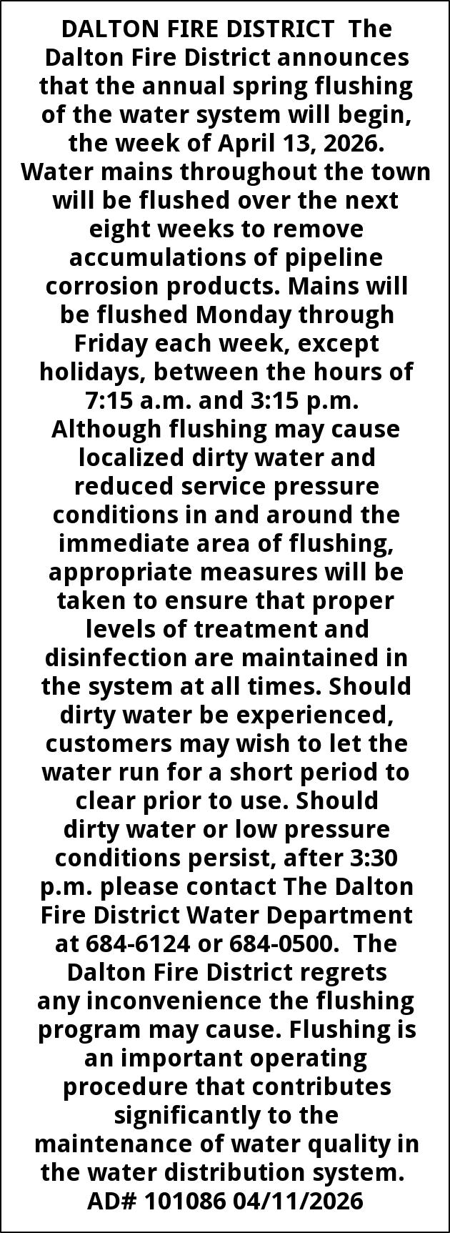 DALTON FIRE DISTRICT The Dalton Fire District announces that the annual spring flushing of the water system will begin, the week of April 13, 2026. Water mains throughout the town will be flushed over the next eight weeks to remove accumulations of pipeline corrosion products. Mains will be flushed Monday through Friday each week, except holidays, between the hours of 7:15 a.m. and 3:15 p.m. Although flushing may cause localized dirty water and reduced service pressure conditions in and around the immediate area of flushing, appropriate measures will be taken to ensure that proper levels of treatment and disinfection are maintained in the system at all times. Should dirty water be experienced, customers may wish to let the water run for a short period to clear prior to use. Should dirty water or low pressure conditions persist, after 3:30 p.m. please contact The Dalton Fire District Water Department at 684-6124 or 684-0500. The Dalton Fire District regrets any inconvenience the flushing program may cause. Flushing is an important operating procedure that contributes significantly to the maintenance of water quality in the water distribution system. AD# 101086 04/11/2026