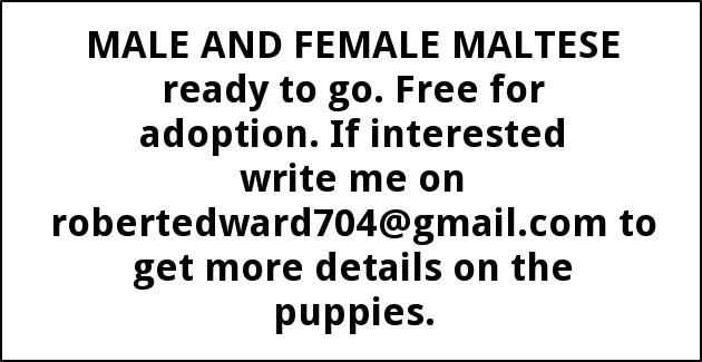 MALE AND FEMALE MALTESE ready to go. Free for adoption. If interested write me on robertedward704@gmail.com to get more details on the puppies.