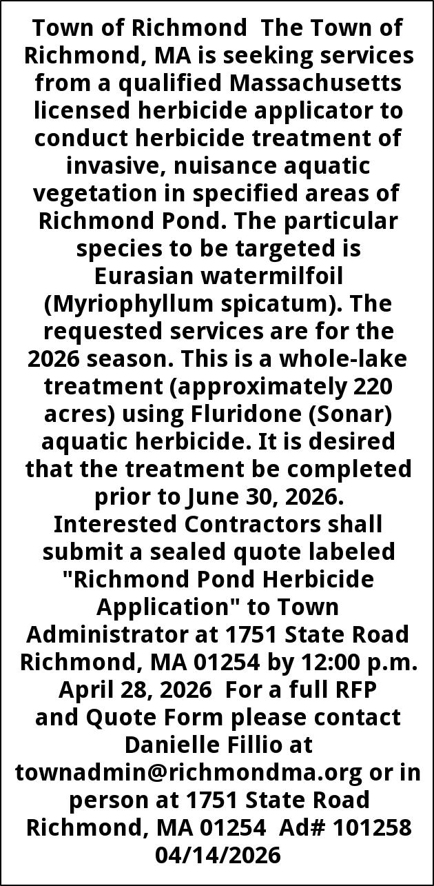 Town of Richmond The Town of Richmond, MA is seeking services from a qualified Massachusetts licensed herbicide applicator to conduct herbicide treatment of invasive, nuisance aquatic vegetation in specified areas of Richmond Pond. The particular species to be targeted is Eurasian watermilfoil (Myriophyllum spicatum). The requested services are for the 2026 season. This is a whole-lake treatment (approximately 220 acres) using Fluridone (Sonar) aquatic herbicide. It is desired that the treatment be completed prior to June 30, 2026. Interested Contractors shall submit a sealed quote labeled "Richmond Pond Herbicide Application" to Town Administrator at 1751 State Road Richmond, MA 01254 by 12:00 p.m. April 28, 2026 For a full RFP and Quote Form please contact Danielle Fillio at townadmin@richmondma.org or in person at 1751 State Road Richmond, MA 01254 Ad# 101258 04/14/2026