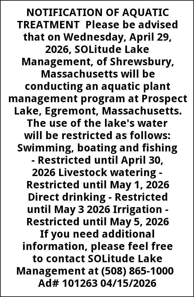NOTIFICATION OF AQUATIC TREATMENT Please be advised that on Wednesday, April 29, 2026, SOLitude Lake Management, of Shrewsbury, Massachusetts will be conducting an aquatic plant management program at Prospect Lake, Egremont, Massachusetts. The use of the lake's water will be restricted as follows: Swimming, boating and fishing - Restricted until April 30, 2026 Livestock watering - Restricted until May 1, 2026 Direct drinking - Restricted until May 3 2026 Irrigation - Restricted until May 5, 2026 If you need additional information, please feel free to contact SOLitude Lake Management at (508) 865-1000 Ad# 101263 04/15/2026