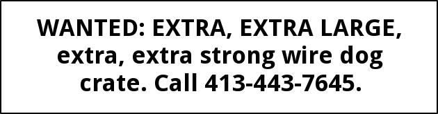 WANTED: EXTRA, EXTRA LARGE, extra, extra strong wire dog crate. Call 413-443-7645.