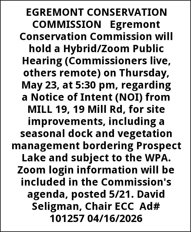 EGREMONT CONSERVATION COMMISSION Egremont Conservation Commission will hold a Hybrid/Zoom Public Hearing (Commissioners live, others remote) on Thursday, May 23, at 5:30 pm, regarding a Notice of Intent (NOI) from MILL 19, 19 Mill Rd, for site improvements, including a seasonal dock and vegetation management bordering Prospect Lake and subject to the WPA. Zoom login information will be included in the Commission's agenda, posted 5/21. David Seligman, Chair ECC Ad# 101257 04/16/2026