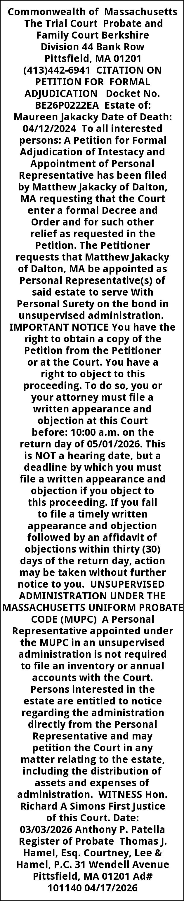 Commonwealth of Massachusetts The Trial Court Probate and Family Court Berkshire Division 44 Bank Row Pittsfield, MA 01201 (413)442-6941 CITATION ON PETITION FOR FORMAL ADJUDICATION Docket No. BE26P0222EA Estate of: Maureen Jakacky Date of Death: 04/12/2024 To all interested persons: A Petition for Formal Adjudication of Intestacy and Appointment of Personal Representative has been filed by Matthew Jakacky of Dalton, MA requesting that the Court enter a formal Decree and Order and for such other relief as requested in the Petition. The Petitioner requests that Matthew Jakacky of Dalton, MA be appointed as Personal Representative(s) of said estate to serve With Personal Surety on the bond in unsupervised administration. IMPORTANT NOTICE You have the right to obtain a copy of the Petition from the Petitioner or at the Court. You have a right to object to this proceeding. To do so, you or your attorney must file a written appearance and objection at this Court before: 10:00 a.m. on the return day of 05/01/2026. This is NOT a hearing date, but a deadline by which you must file a written appearance and objection if you object to this proceeding. If you fail to file a timely written appearance and objection followed by an affidavit of objections within thirty (30) days of the return day, action may be taken without further notice to you. UNSUPERVISED ADMINISTRATION UNDER THE MASSACHUSETTS UNIFORM PROBATE CODE (MUPC) A Personal Representative appointed under the MUPC in an unsupervised administration is not required to file an inventory or annual accounts with the Court. Persons interested in the estate are entitled to notice regarding the administration directly from the Personal Representative and may petition the Court in any matter relating to the estate, including the distribution of assets and expenses of administration. WITNESS Hon. Richard A Simons First Justice of this Court. Date: 03/03/2026 Anthony P. Patella Register of Probate Thomas J. Hamel, Esq. Courtney, Lee & Hamel, P.C. 31 Wendell Avenue Pittsfield, MA 01201 Ad# 101140 04/17/2026