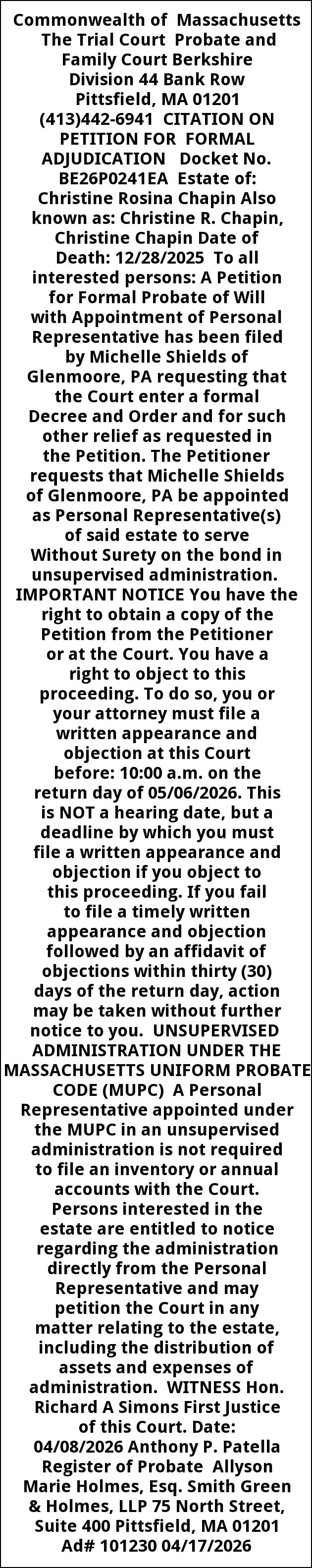 Commonwealth of Massachusetts The Trial Court Probate and Family Court Berkshire Division 44 Bank Row Pittsfield, MA 01201 (413)442-6941 CITATION ON PETITION FOR FORMAL ADJUDICATION Docket No. BE26P0241EA Estate of: Christine Rosina Chapin Also known as: Christine R. Chapin, Christine Chapin Date of Death: 12/28/2025 To all interested persons: A Petition for Formal Probate of Will with Appointment of Personal Representative has been filed by Michelle Shields of Glenmoore, PA requesting that the Court enter a formal Decree and Order and for such other relief as requested in the Petition. The Petitioner requests that Michelle Shields of Glenmoore, PA be appointed as Personal Representative(s) of said estate to serve Without Surety on the bond in unsupervised administration. IMPORTANT NOTICE You have the right to obtain a copy of the Petition from the Petitioner or at the Court. You have a right to object to this proceeding. To do so, you or your attorney must file a written appearance and objection at this Court before: 10:00 a.m. on the return day of 05/06/2026. This is NOT a hearing date, but a deadline by which you must file a written appearance and objection if you object to this proceeding. If you fail to file a timely written appearance and objection followed by an affidavit of objections within thirty (30) days of the return day, action may be taken without further notice to you. UNSUPERVISED ADMINISTRATION UNDER THE MASSACHUSETTS UNIFORM PROBATE CODE (MUPC) A Personal Representative appointed under the MUPC in an unsupervised administration is not required to file an inventory or annual accounts with the Court. Persons interested in the estate are entitled to notice regarding the administration directly from the Personal Representative and may petition the Court in any matter relating to the estate, including the distribution of assets and expenses of administration. WITNESS Hon. Richard A Simons First Justice of this Court. Date: 04/08/2026 Anthony P. Patella Register of Probate Allyson Marie Holmes, Esq. Smith Green & Holmes, LLP 75 North Street, Suite 400 Pittsfield, MA 01201 Ad# 101230 04/17/2026