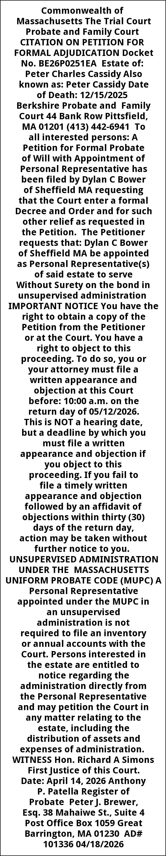 Commonwealth of Massachusetts The Trial Court Probate and Family Court CITATION ON PETITION FOR FORMAL ADJUDICATION Docket No. BE26P0251EA Estate of: Peter Charles Cassidy Also known as: Peter Cassidy Date of Death: 12/15/2025 Berkshire Probate and Family Court 44 Bank Row Pittsfield, MA 01201 (413) 442-6941 To all interested persons: A Petition for Formal Probate of Will with Appointment of Personal Representative has been filed by Dylan C Bower of Sheffield MA requesting that the Court enter a formal Decree and Order and for such other relief as requested in the Petition. The Petitioner requests that: Dylan C Bower of Sheffield MA be appointed as Personal Representative(s) of said estate to serve Without Surety on the bond in unsupervised administration IMPORTANT NOTICE You have the right to obtain a copy of the Petition from the Petitioner or at the Court. You have a right to object to this proceeding. To do so, you or your attorney must file a written appearance and objection at this Court before: 10:00 a.m. on the return day of 05/12/2026. This is NOT a hearing date, but a deadline by which you must file a written appearance and objection if you object to this proceeding. If you fail to file a timely written appearance and objection followed by an affidavit of objections within thirty (30) days of the return day, action may be taken without further notice to you. UNSUPERVISED ADMINISTRATION UNDER THE MASSACHUSETTS UNIFORM PROBATE CODE (MUPC) A Personal Representative appointed under the MUPC in an unsupervised administration is not required to file an inventory or annual accounts with the Court. Persons interested in the estate are entitled to notice regarding the administration directly from the Personal Representative and may petition the Court in any matter relating to the estate, including the distribution of assets and expenses of administration. WITNESS Hon. Richard A Simons First Justice of this Court. Date: April 14, 2026 Anthony P. Patella Register of Probate Peter J. Brewer, Esq. 38 Mahaiwe St., Suite 4 Post Office Box 1059 Great Barrington, MA 01230 AD# 101336 04/18/2026