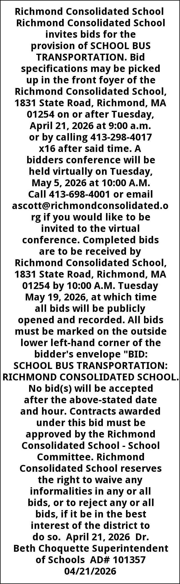 Richmond Consolidated School Richmond Consolidated School invites bids for the provision of SCHOOL BUS TRANSPORTATION. Bid specifications may be picked up in the front foyer of the Richmond Consolidated School, 1831 State Road, Richmond, MA 01254 on or after Tuesday, April 21, 2026 at 9:00 a.m. or by calling 413-298-4017 x16 after said time. A bidders conference will be held virtually on Tuesday, May 5, 2026 at 10:00 A.M. Call 413-698-4001 or email ascott@richmondconsolidated.org if you would like to be invited to the virtual conference. Completed bids are to be received by Richmond Consolidated School, 1831 State Road, Richmond, MA 01254 by 10:00 A.M. Tuesday May 19, 2026, at which time all bids will be publicly opened and recorded. All bids must be marked on the outside lower left-hand corner of the bidder's envelope "BID: SCHOOL BUS TRANSPORTATION: RICHMOND CONSOLIDATED SCHOOL. No bid(s) will be accepted after the above-stated date and hour. Contracts awarded under this bid must be approved by the Richmond Consolidated School - School Committee. Richmond Consolidated School reserves the right to waive any informalities in any or all bids, or to reject any or all bids, if it be in the best interest of the district to do so. April 21, 2026 Dr. Beth Choquette Superintendent of Schools AD# 101357 04/21/2026