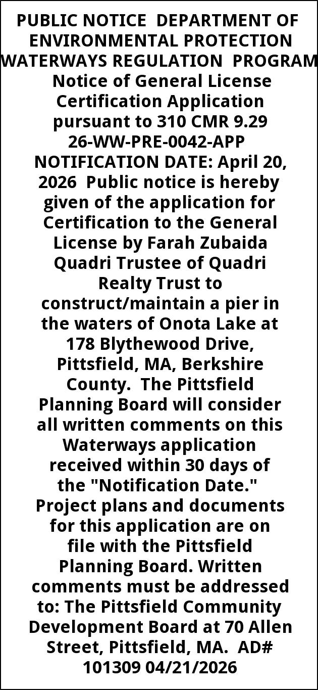 PUBLIC NOTICE DEPARTMENT OF ENVIRONMENTAL PROTECTION WATERWAYS REGULATION PROGRAM Notice of General License Certification Application pursuant to 310 CMR 9.29 26-WW-PRE-0042-APP NOTIFICATION DATE: April 20, 2026 Public notice is hereby given of the application for Certification to the General License by Farah Zubaida Quadri Trustee of Quadri Realty Trust to construct/maintain a pier in the waters of Onota Lake at 178 Blythewood Drive, Pittsfield, MA, Berkshire County. The Pittsfield Planning Board will consider all written comments on this Waterways application received within 30 days of the "Notification Date." Project plans and documents for this application are on file with the Pittsfield Planning Board. Written comments must be addressed to: The Pittsfield Community Development Board at 70 Allen Street, Pittsfield, MA. AD# 101309 04/21/2026