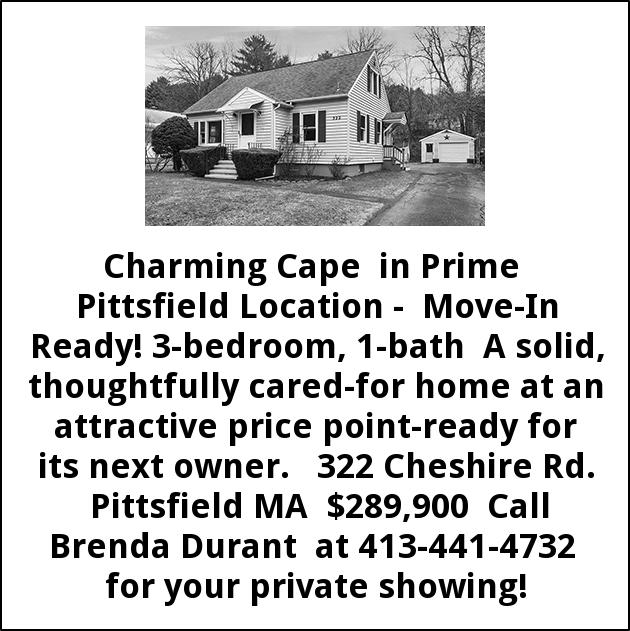Charming Cape in Prime Pittsfield Location - Move-In Ready! 3-bedroom, 1-bath A solid, thoughtfully cared-for home at an attractive price point-ready for its next owner. 322 Cheshire Rd. Pittsfield MA $289,900 Call Brenda Durant at 413-441-4732 for your private showing!