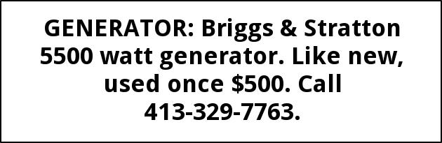 GENERATOR: Briggs & Stratton 5500 watt generator. Like new, used once $500. Call 413-329-7763.