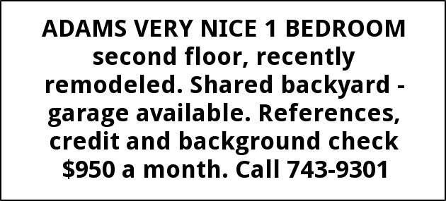 ADAMS VERY NICE 1 BEDROOM second floor, recently remodeled. Shared backyard - garage available. References, credit and background check $950 a month. Call 743-9301