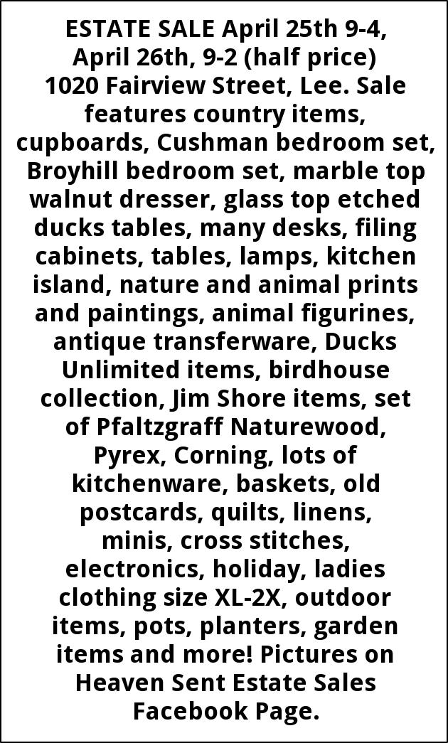 ESTATE SALE April 25th 9-4, April 26th, 9-2 (half price) 1020 Fairview Street, Lee. Sale features country items, cupboards, Cushman bedroom set, Broyhill bedroom set, marble top walnut dresser, glass top etched ducks tables, many desks, filing cabinets, tables, lamps, kitchen island, nature and animal prints and paintings, animal figurines, antique transferware, Ducks Unlimited items, birdhouse collection, Jim Shore items, set of Pfaltzgraff Naturewood, Pyrex, Corning, lots of kitchenware, baskets, old postcards, quilts, linens, minis, cross stitches, electronics, holiday, ladies clothing size XL-2X, outdoor items, pots, planters, garden items and more! Pictures on Heaven Sent Estate Sales Facebook Page.