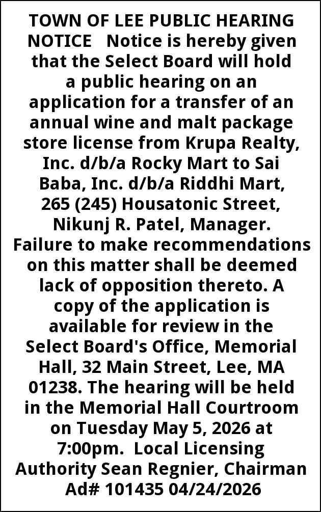 TOWN OF LEE PUBLIC HEARING NOTICE Notice is hereby given that the Select Board will hold a public hearing on an application for a transfer of an annual wine and malt package store license from Krupa Realty, Inc. d/b/a Rocky Mart to Sai Baba, Inc. d/b/a Riddhi Mart, 265 (245) Housatonic Street, Nikunj R. Patel, Manager. Failure to make recommendations on this matter shall be deemed lack of opposition thereto. A copy of the application is available for review in the Select Board's Office, Memorial Hall, 32 Main Street, Lee, MA 01238. The hearing will be held in the Memorial Hall Courtroom on Tuesday May 5, 2026 at 7:00pm. Local Licensing Authority Sean Regnier, Chairman Ad# 101435 04/24/2026