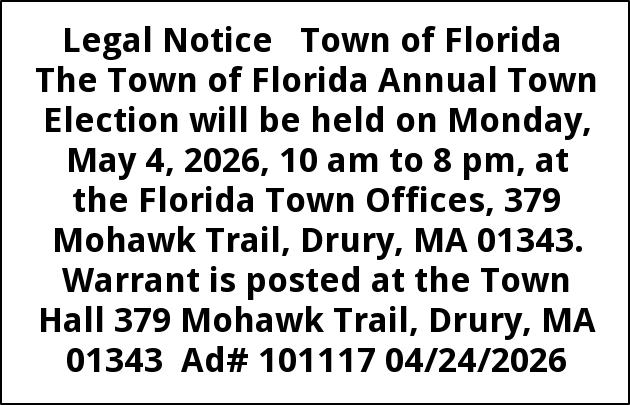 Legal Notice Town of Florida The Town of Florida Annual Town Election will be held on Monday, May 4, 2026, 10 am to 8 pm, at the Florida Town Offices, 379 Mohawk Trail, Drury, MA 01343. Warrant is posted at the Town Hall 379 Mohawk Trail, Drury, MA 01343 Ad# 101117 04/24/2026