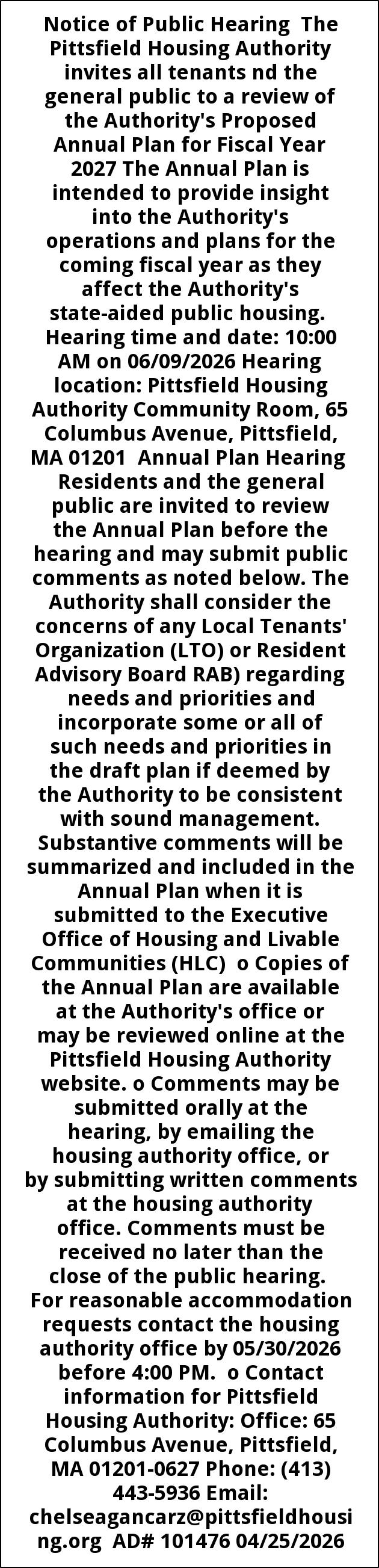 Notice of Public Hearing The Pittsfield Housing Authority invites all tenants nd the general public to a review of the Authority's Proposed Annual Plan for Fiscal Year 2027 The Annual Plan is intended to provide insight into the Authority's operations and plans for the coming fiscal year as they affect the Authority's state-aided public housing. Hearing time and date: 10:00 AM on 06/09/2026 Hearing location: Pittsfield Housing Authority Community Room, 65 Columbus Avenue, Pittsfield, MA 01201 Annual Plan Hearing Residents and the general public are invited to review the Annual Plan before the hearing and may submit public comments as noted below. The Authority shall consider the concerns of any Local Tenants' Organization (LTO) or Resident Advisory Board RAB) regarding needs and priorities and incorporate some or all of such needs and priorities in the draft plan if deemed by the Authority to be consistent with sound management. Substantive comments will be summarized and included in the Annual Plan when it is submitted to the Executive Office of Housing and Livable Communities (HLC) o Copies of the Annual Plan are available at the Authority's office or may be reviewed online at the Pittsfield Housing Authority website. o Comments may be submitted orally at the hearing, by emailing the housing authority office, or by submitting written comments at the housing authority office. Comments must be received no later than the close of the public hearing. For reasonable accommodation requests contact the housing authority office by 05/30/2026 before 4:00 PM. o Contact information for Pittsfield Housing Authority: Office: 65 Columbus Avenue, Pittsfield, MA 01201-0627 Phone: (413) 443-5936 Email: chelseagancarz@pittsfieldhousing.org AD# 101476 04/25/2026