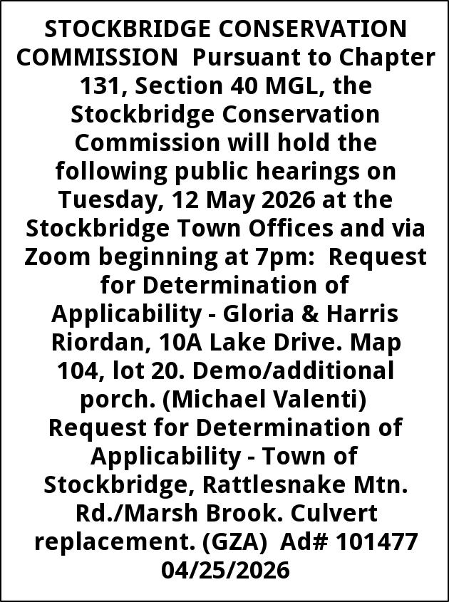 STOCKBRIDGE CONSERVATION COMMISSION Pursuant to Chapter 131, Section 40 MGL, the Stockbridge Conservation Commission will hold the following public hearings on Tuesday, 12 May 2026 at the Stockbridge Town Offices and via Zoom beginning at 7pm: Request for Determination of Applicability - Gloria & Harris Riordan, 10A Lake Drive. Map 104, lot 20. Demo/additional porch. (Michael Valenti) Request for Determination of Applicability - Town of Stockbridge, Rattlesnake Mtn. Rd./Marsh Brook. Culvert replacement. (GZA) Ad# 101477 04/25/2026