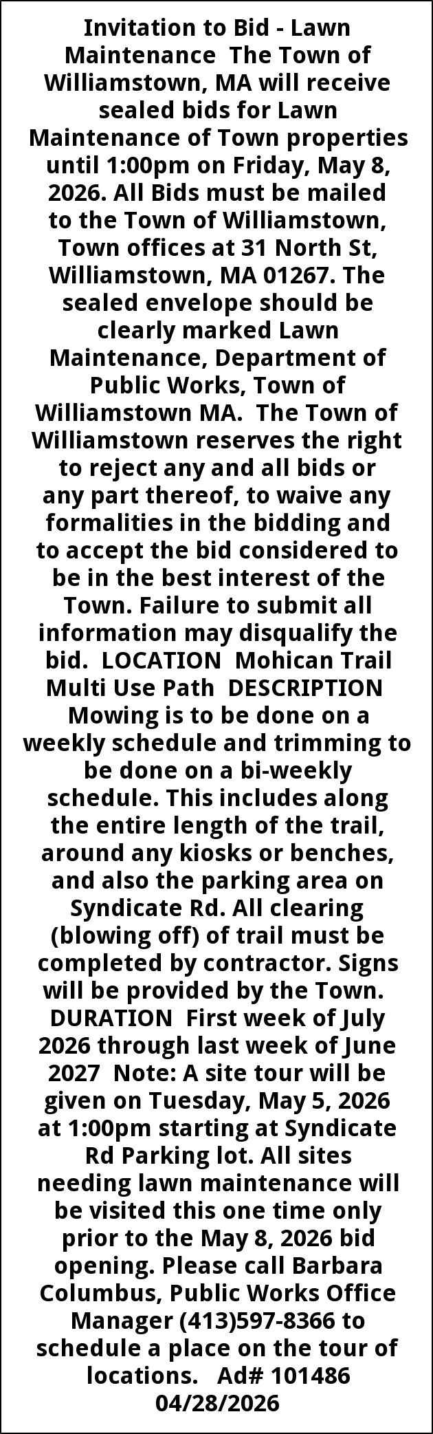 Invitation to Bid - Lawn Maintenance The Town of Williamstown, MA will receive sealed bids for Lawn Maintenance of Town properties until 1:00pm on Friday, May 8, 2026. All Bids must be mailed to the Town of Williamstown, Town offices at 31 North St, Williamstown, MA 01267. The sealed envelope should be clearly marked Lawn Maintenance, Department of Public Works, Town of Williamstown MA. The Town of Williamstown reserves the right to reject any and all bids or any part thereof, to waive any formalities in the bidding and to accept the bid considered to be in the best interest of the Town. Failure to submit all information may disqualify the bid. LOCATION Mohican Trail Multi Use Path DESCRIPTION Mowing is to be done on a weekly schedule and trimming to be done on a bi-weekly schedule. This includes along the entire length of the trail, around any kiosks or benches, and also the parking area on Syndicate Rd. All clearing (blowing off) of trail must be completed by contractor. Signs will be provided by the Town. DURATION First week of July 2026 through last week of June 2027 Note: A site tour will be given on Tuesday, May 5, 2026 at 1:00pm starting at Syndicate Rd Parking lot. All sites needing lawn maintenance will be visited this one time only prior to the May 8, 2026 bid opening. Please call Barbara Columbus, Public Works Office Manager (413)597-8366 to schedule a place on the tour of locations. Ad# 101486 04/28/2026