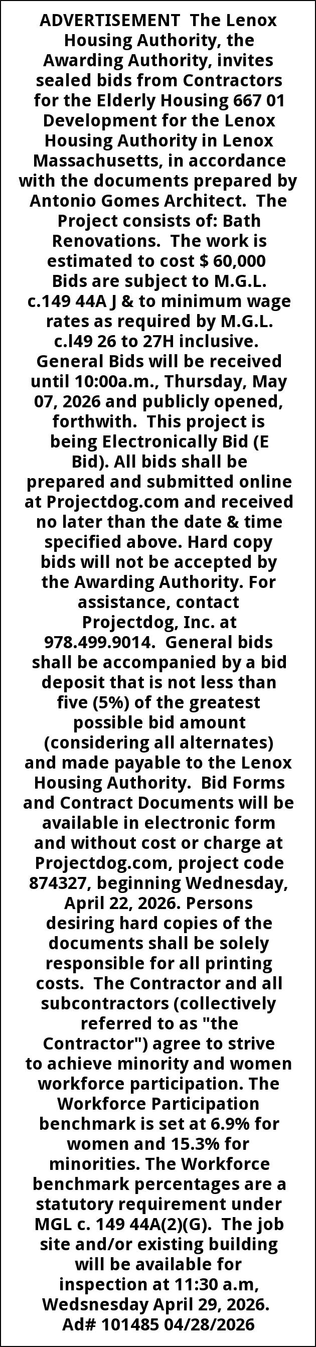 ADVERTISEMENT The Lenox Housing Authority, the Awarding Authority, invites sealed bids from Contractors for the Elderly Housing 667 01 Development for the Lenox Housing Authority in Lenox Massachusetts, in accordance with the documents prepared by Antonio Gomes Architect. The Project consists of: Bath Renovations. The work is estimated to cost $ 60,000 Bids are subject to M.G.L. c.149 44A J & to minimum wage rates as required by M.G.L. c.l49 26 to 27H inclusive. General Bids will be received until 10:00a.m., Thursday, May 07, 2026 and publicly opened, forthwith. This project is being Electronically Bid (E Bid). All bids shall be prepared and submitted online at Projectdog.com and received no later than the date & time specified above. Hard copy bids will not be accepted by the Awarding Authority. For assistance, contact Projectdog, Inc. at 978.499.9014. General bids shall be accompanied by a bid deposit that is not less than five (5%) of the greatest possible bid amount (considering all alternates) and made payable to the Lenox Housing Authority. Bid Forms and Contract Documents will be available in electronic form and without cost or charge at Projectdog.com, project code 874327, beginning Wednesday, April 22, 2026. Persons desiring hard copies of the documents shall be solely responsible for all printing costs. The Contractor and all subcontractors (collectively referred to as "the Contractor") agree to strive to achieve minority and women workforce participation. The Workforce Participation benchmark is set at 6.9% for women and 15.3% for minorities. The Workforce benchmark percentages are a statutory requirement under MGL c. 149 44A(2)(G). The job site and/or existing building will be available for inspection at 11:30 a.m, Wedsnesday April 29, 2026. Ad# 101485 04/28/2026