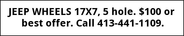 JEEP WHEELS 17X7, 5 hole. $100 or best offer. Call 413-441-1109.