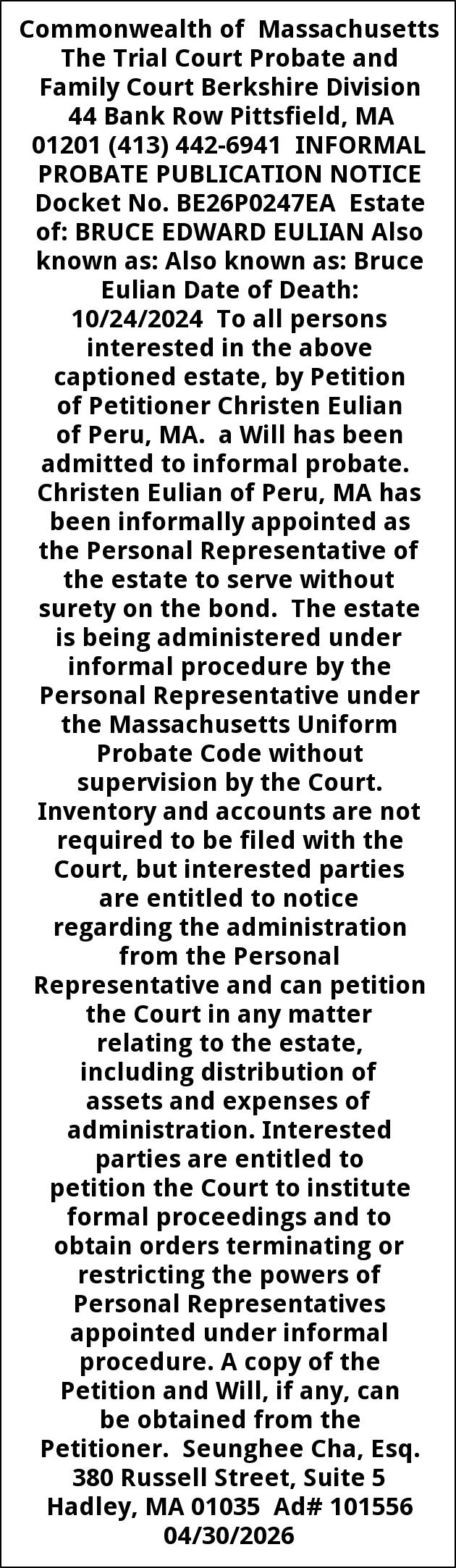 Commonwealth of Massachusetts The Trial Court Probate and Family Court Berkshire Division 44 Bank Row Pittsfield, MA 01201 (413) 442-6941 INFORMAL PROBATE PUBLICATION NOTICE Docket No. BE26P0247EA Estate of: BRUCE EDWARD EULIAN Also known as: Also known as: Bruce Eulian Date of Death: 10/24/2024 To all persons interested in the above captioned estate, by Petition of Petitioner Christen Eulian of Peru, MA. a Will has been admitted to informal probate. Christen Eulian of Peru, MA has been informally appointed as the Personal Representative of the estate to serve without surety on the bond. The estate is being administered under informal procedure by the Personal Representative under the Massachusetts Uniform Probate Code without supervision by the Court. Inventory and accounts are not required to be filed with the Court, but interested parties are entitled to notice regarding the administration from the Personal Representative and can petition the Court in any matter relating to the estate, including distribution of assets and expenses of administration. Interested parties are entitled to petition the Court to institute formal proceedings and to obtain orders terminating or restricting the powers of Personal Representatives appointed under informal procedure. A copy of the Petition and Will, if any, can be obtained from the Petitioner. Seunghee Cha, Esq. 380 Russell Street, Suite 5 Hadley, MA 01035 Ad# 101556 04/30/2026