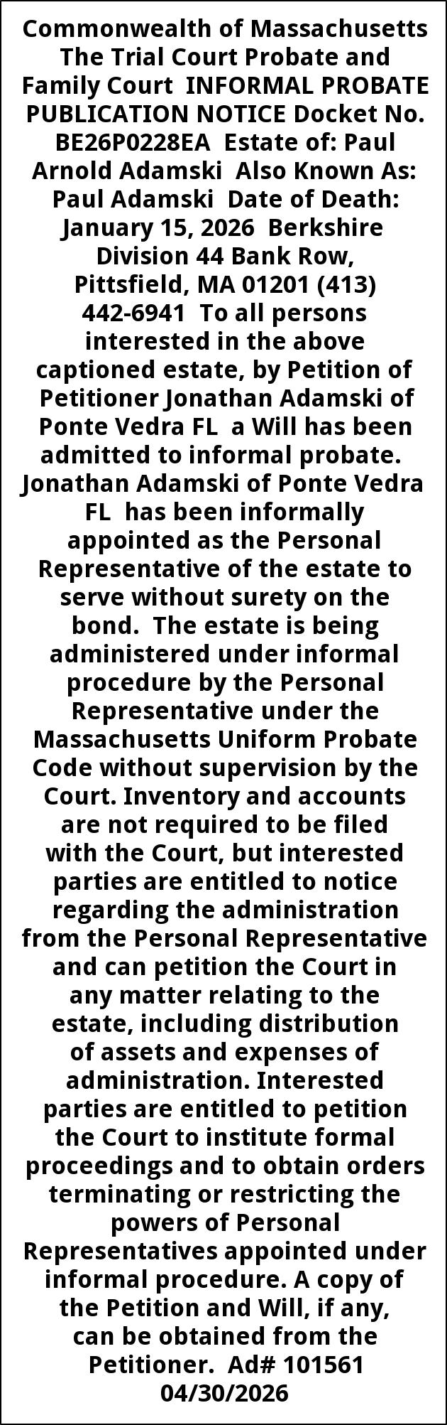 Commonwealth of Massachusetts The Trial Court Probate and Family Court INFORMAL PROBATE PUBLICATION NOTICE Docket No. BE26P0228EA Estate of: Paul Arnold Adamski Also Known As: Paul Adamski Date of Death: January 15, 2026 Berkshire Division 44 Bank Row, Pittsfield, MA 01201 (413) 442-6941 To all persons interested in the above captioned estate, by Petition of Petitioner Jonathan Adamski of Ponte Vedra FL a Will has been admitted to informal probate. Jonathan Adamski of Ponte Vedra FL has been informally appointed as the Personal Representative of the estate to serve without surety on the bond. The estate is being administered under informal procedure by the Personal Representative under the Massachusetts Uniform Probate Code without supervision by the Court. Inventory and accounts are not required to be filed with the Court, but interested parties are entitled to notice regarding the administration from the Personal Representative and can petition the Court in any matter relating to the estate, including distribution of assets and expenses of administration. Interested parties are entitled to petition the Court to institute formal proceedings and to obtain orders terminating or restricting the powers of Personal Representatives appointed under informal procedure. A copy of the Petition and Will, if any, can be obtained from the Petitioner. Ad# 101561 04/30/2026