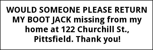 WOULD SOMEONE PLEASE RETURN MY BOOT JACK missing from my home at 122 Churchill St., Pittsfield. Thank you!