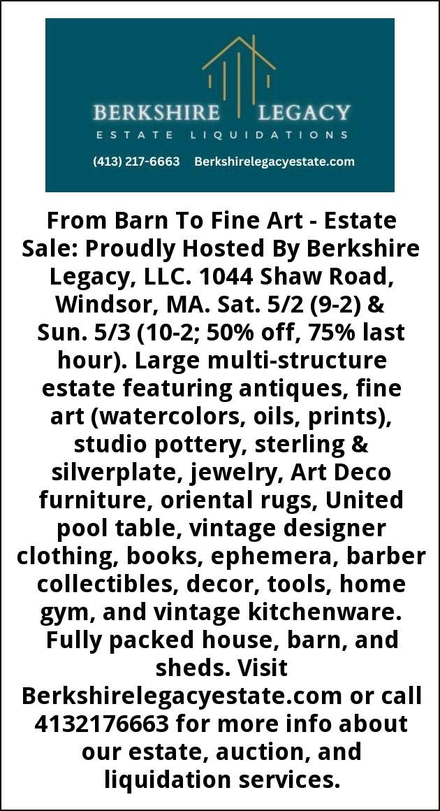 From Barn To Fine Art - Estate Sale: Proudly Hosted By Berkshire Legacy, LLC. 1044 Shaw Road, Windsor, MA. Sat. 5/2 (9-2) & Sun. 5/3 (10-2; 50% off, 75% last hour). Large multi-structure estate featuring antiques, fine art (watercolors, oils, prints), studio pottery, sterling & silverplate, jewelry, Art Deco furniture, oriental rugs, United pool table, vintage designer clothing, books, ephemera, barber collectibles, decor, tools, home gym, and vintage kitchenware. Fully packed house, barn, and sheds. Visit Berkshirelegacyestate.com or call 4132176663 for more info about our estate, auction, and liquidation services.